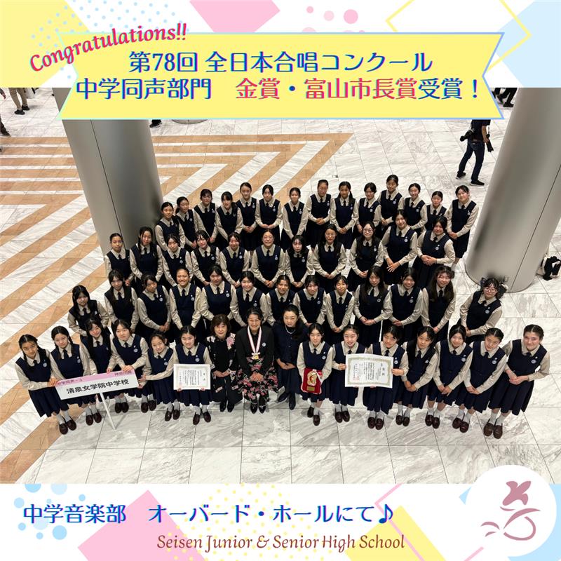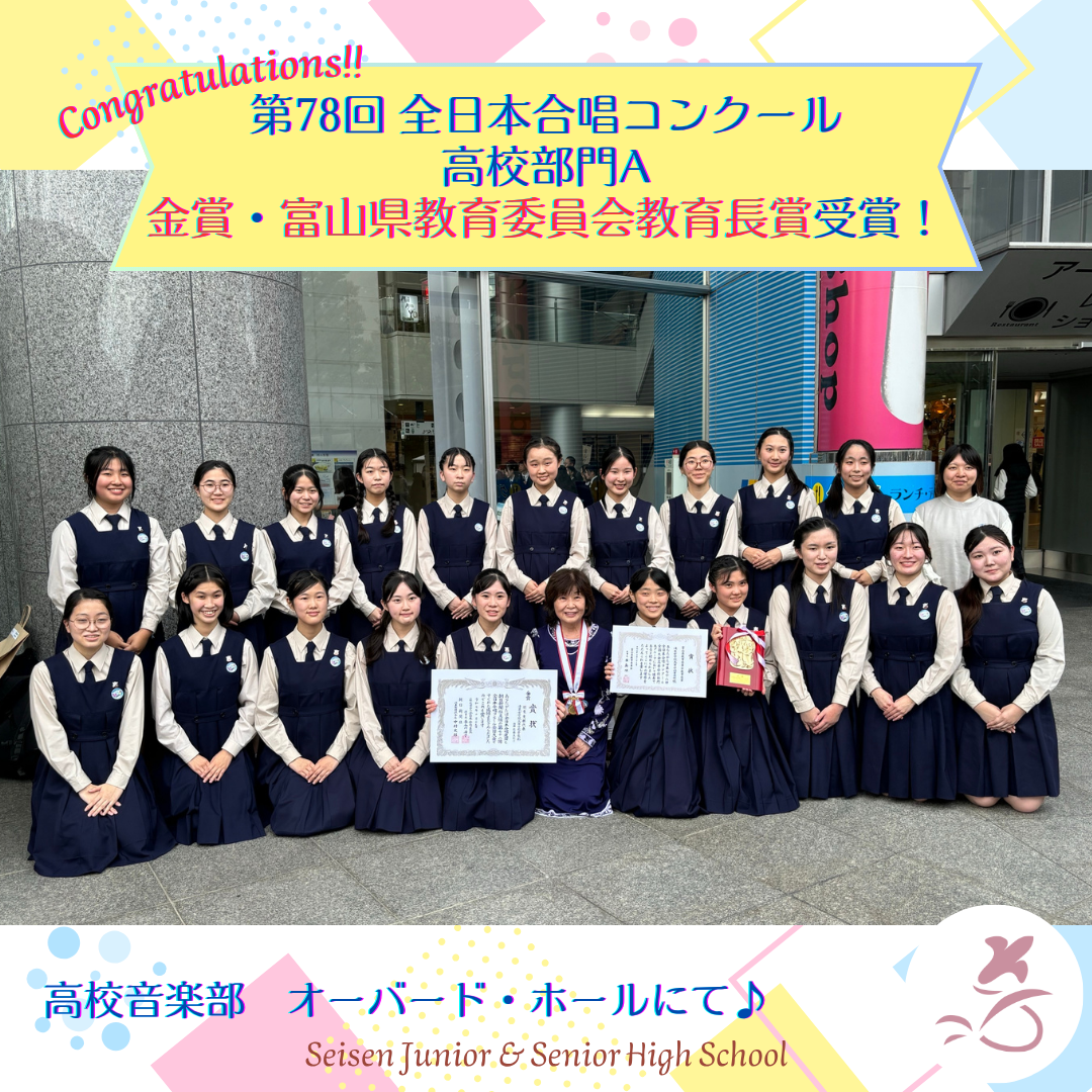 🏆音楽部 金賞!🏅 2025.10.27 清泉ライフ 10月25日・26日に富山県にて開催された全日本合唱コンクール全国大会で、中高ともに金賞をいただきました! また、高校生は富山県教育委員会教育長賞、中学生は富山市長賞を受賞しました。 皆様の温かい応援に、心より感謝申し上げます。 高校音楽部in富山中学音楽部in富山 前の記事へ