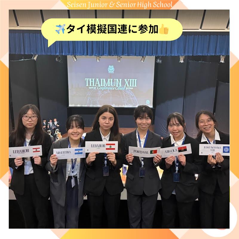 ✈️タイ模擬国連に参加しました👍 2026.04.11 清泉ライフ 先月、バンコクで行われた模擬国連に高1の6名が参加。 All English の白熱の議場に圧倒されながらも自分たちのスピーチはしっかりとできました! 大会の後はお楽しみの市内観光♪タイの文化と歴史を肌で感じ取った6日間でした。 新版 Seisen Junior & Senior High School (11) 1thaimun2thaimun1thaimun3 前の記事へ